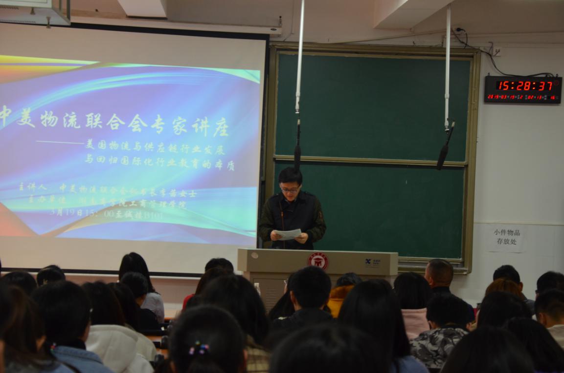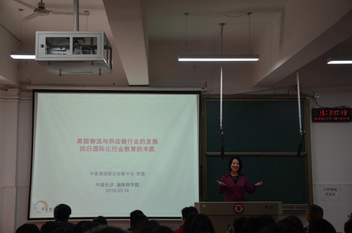 2019年3月19日下午15:00,由湖南商学院工商管理学院、湖南商学院工商管理学院物流管理系主办的中美物流联合会专家讲座在湖南商学院至诚楼B106举行。本次讲座特邀请中美物流联合会秘书长李茜女士,参会领导及教师有湖南商学院工商管理学院院长黄福华教授,物流管理系主任王松博士,物流管理系党支部书记石彪老师,物流管理系周敏、邓胜前、欧阳小迅、刘长石、孙鹏、赵中平、欧阳强斌、朱桂菊老师,以及湖南商学院大学生物流协会成员,工商管理学院物流管理系学生及相关专业学生等。
