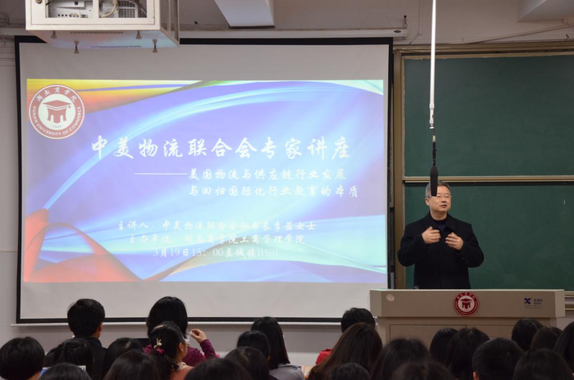 2019年3月19日下午15:00,由湖南商学院工商管理学院、湖南商学院工商管理学院物流管理系主办的中美物流联合会专家讲座在湖南商学院至诚楼B106举行。本次讲座特邀请中美物流联合会秘书长李茜女士,参会领导及教师有湖南商学院工商管理学院院长黄福华教授,物流管理系主任王松博士,物流管理系党支部书记石彪老师,物流管理系周敏、邓胜前、欧阳小迅、刘长石、孙鹏、赵中平、欧阳强斌、朱桂菊老师,以及湖南商学院大学生物流协会成员,工商管理学院物流管理系学生及相关专业学生等。