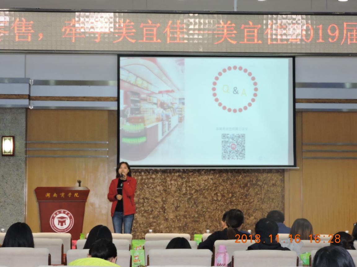紧接着美宜佳人资课长唐达先生以及招聘经理熊丹女士为同学们继续解答了关于招聘的种种问题,包括公司福利,工资,工作时间地点工作性质等种种详细的工作问题。现场还进行了抢红包,提问得礼物等活动。美宜佳公司文化得到了进一步得体现。最后工作人员收集了在场的同学们的简历表进行初面。